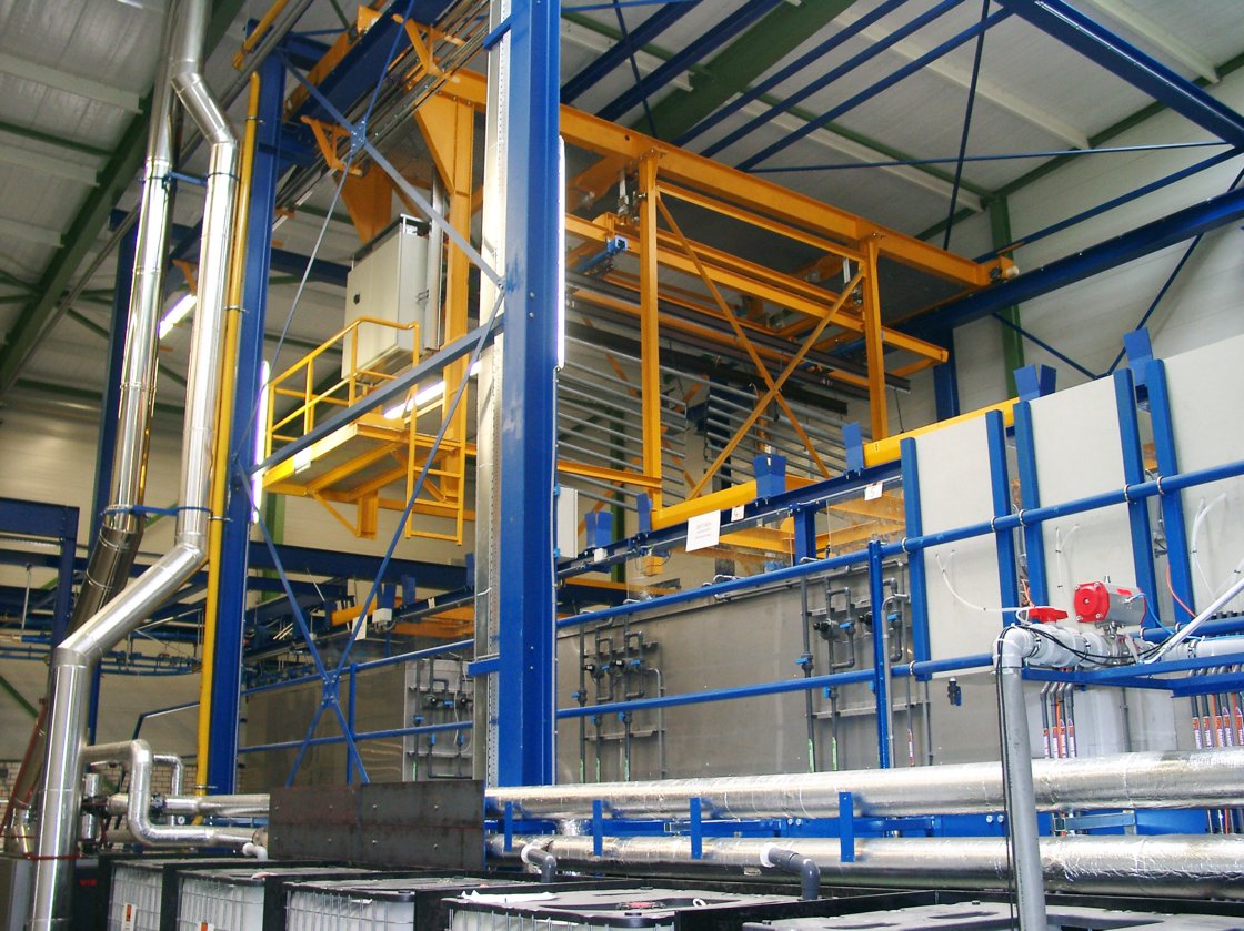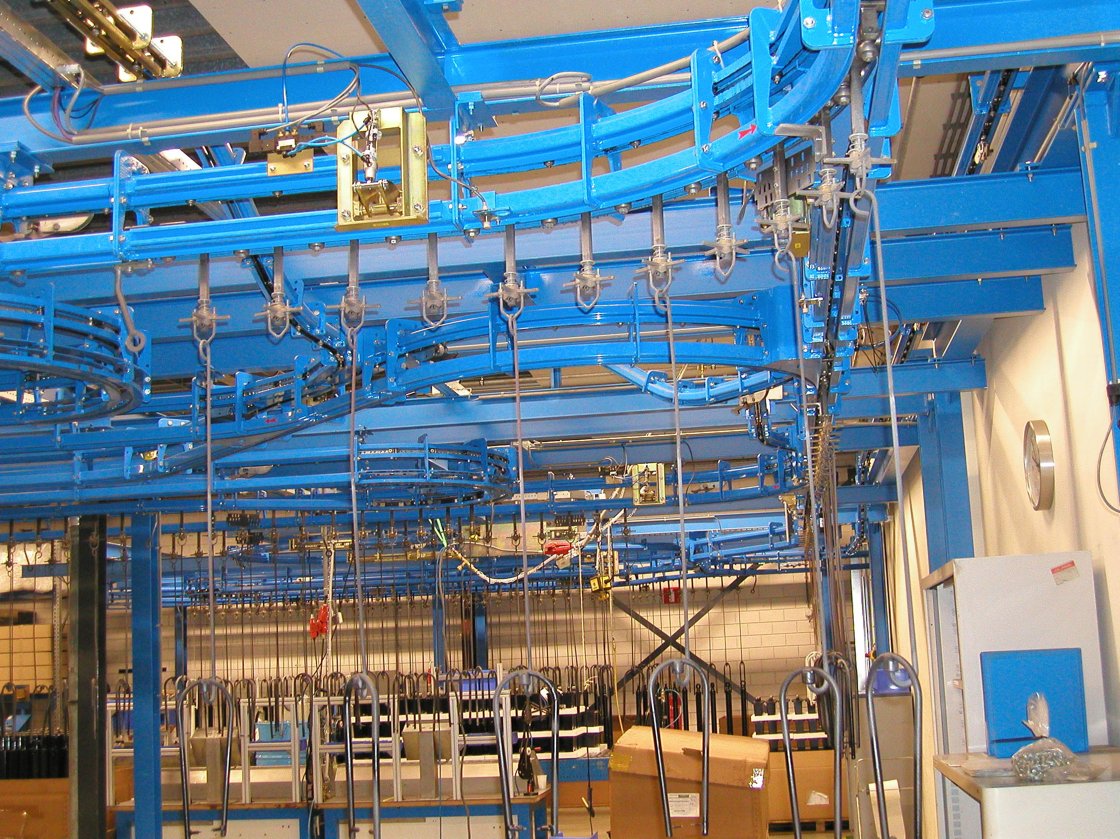 Bijzonder aan de layout van de poedercoatinstallatie is dat de gescheiden transportsystemen samen komen ter plaatse van de poedercabine en de moffeloven, waarbij de producten versprongen achter elkaar door de poedercabine en de moffeloven worden getransporteerd.