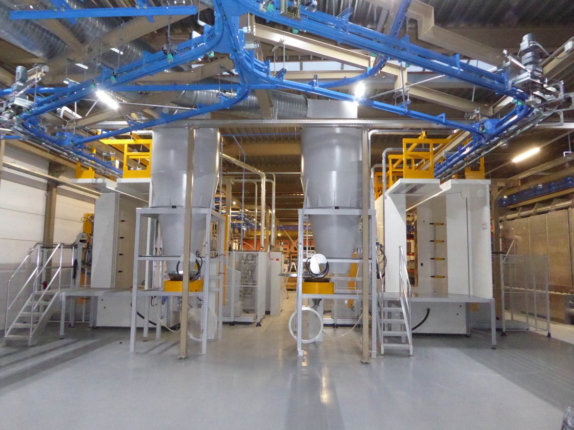 Bijzonder aan de layout van de poedercoatinstallatie is dat de gescheiden transportsystemen samen komen ter plaatse van de poedercabine en de moffeloven, waarbij de producten versprongen achter elkaar door de poedercabine en de moffeloven worden getransporteerd.