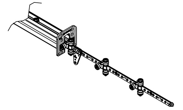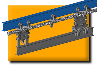 Met bevestiging direct aan een bovenliggend staalprofiel, kan deze ketting zware belastingen transporteren van max. 150 kg per trolley. Het gehele systeem mag belast worden tot 10.000kg.