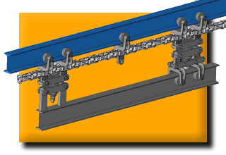 Met bevestiging direct aan een bovenliggend staalprofiel, kan deze ketting zware belastingen transporteren van max. 150 kg per trolley. Het gehele systeem mag belast worden tot 10.000kg.